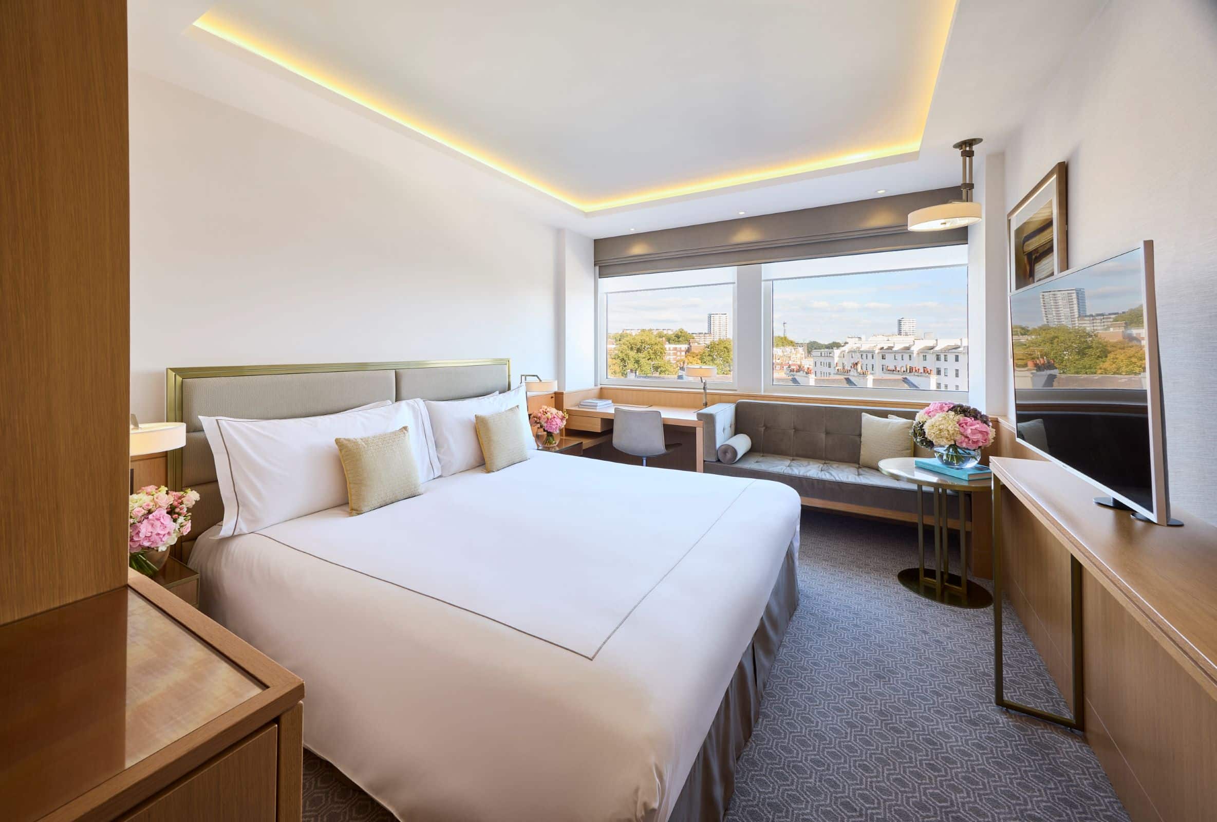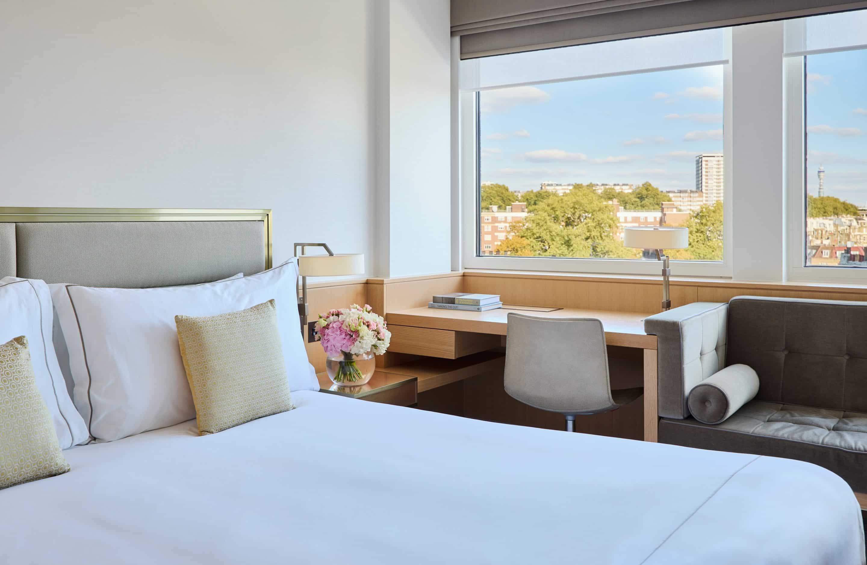 A beautifully designed bedroom with a work desk and stunning views of Hyde Park and the London skyline.