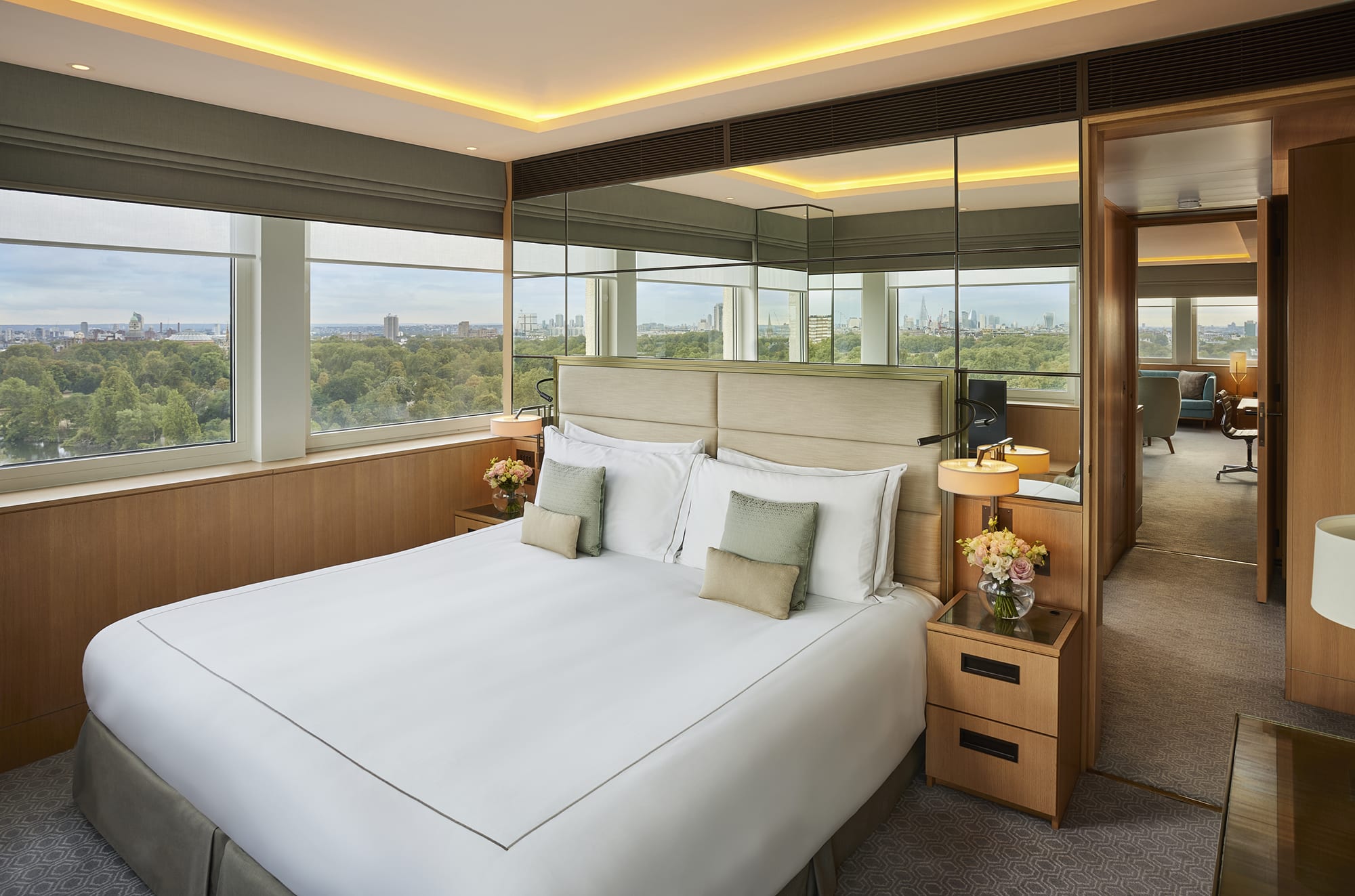 Combine our elegant Park Suite with an interconnecting Classic room for a two bedroom, two bathroom suite, featuring a spacious living area with velvet sofas and a striking glass dining table, ideal for entertaining guests or simply enjoying in room dining in comfort. Unwind in the lavish Carrara marble bathroom with twin sinks, oversized rainfall shower and luxurious bathtub, complete with Jo Loves amenities, underfloor heating and Hyde Park views. At night, stretch out in your luxuriously comfortable King size bed, with crisp white linens and plump, feathery pillows, ready for a blissful night’s sleep.