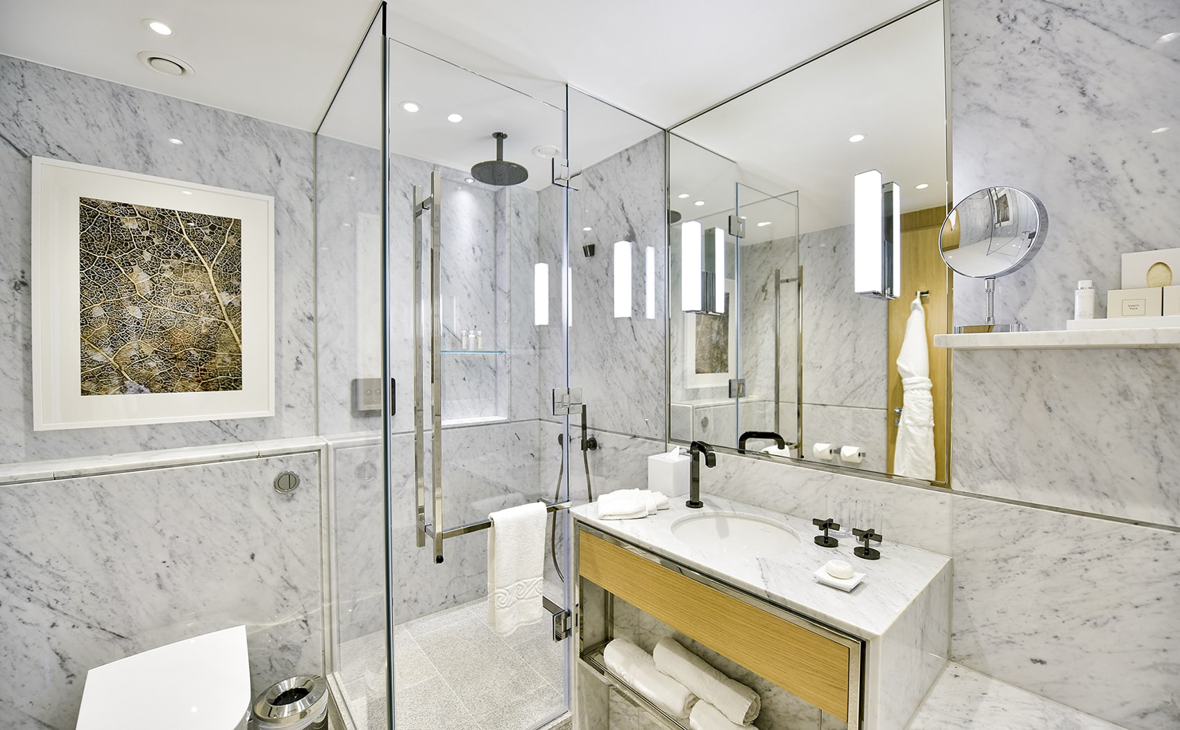 Unwind in the lavish Carrara marble bathroom with rainfall shower and luxurious bathtub, before wrapping up in a fluffy white bathrobe and climbing into your wonderfully comfortable King size beds, with crisp white linens and plump, feathery pillows, for a blissful night’s sleep.