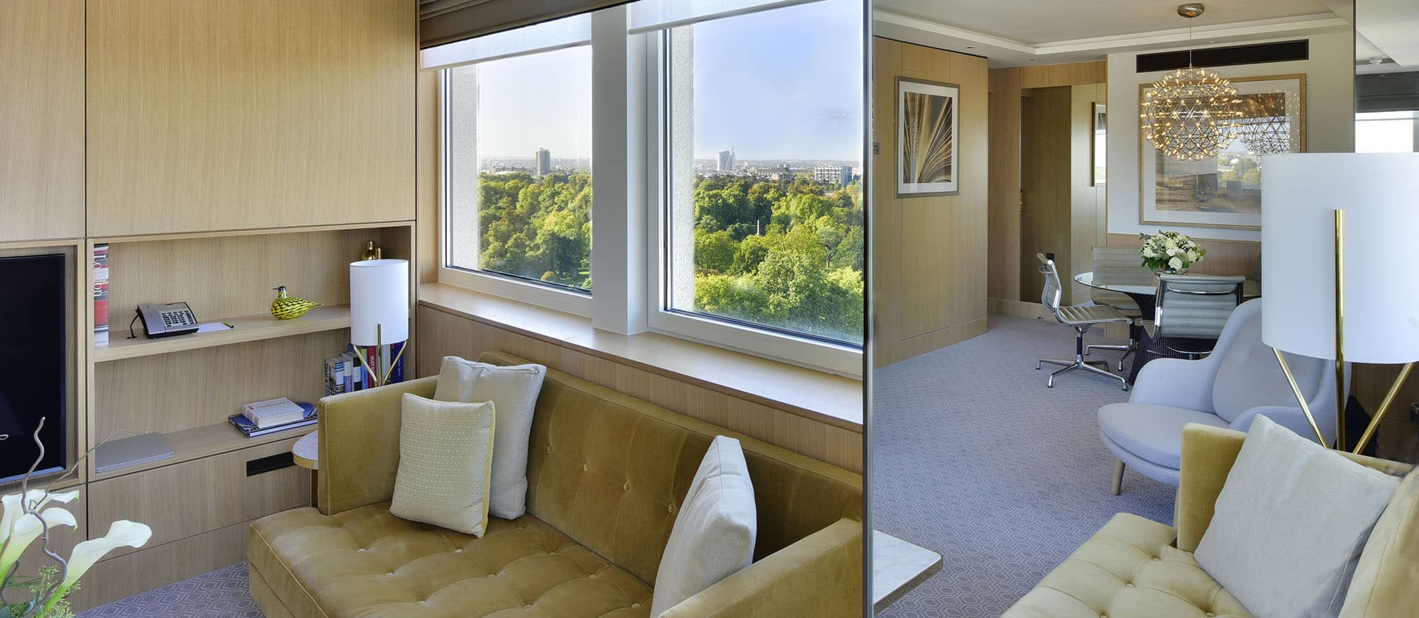 Our Studio Suites provide generous living spaces, a luxurious bedroom, with large seating area and sumptuous sofa, and of course a place to work with spectacular views of Hyde Park and the famous London skyline.